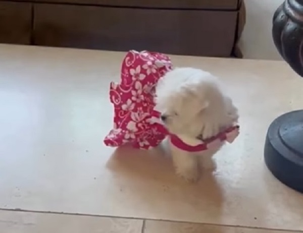 Câinele a fost văzut anterior purtând o rochie roz cu volane, dar și cu o pereche ochelari pe care Britney i-a ținut în fața feței câinelui când filma cu telefonul mobil.