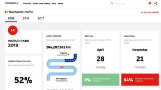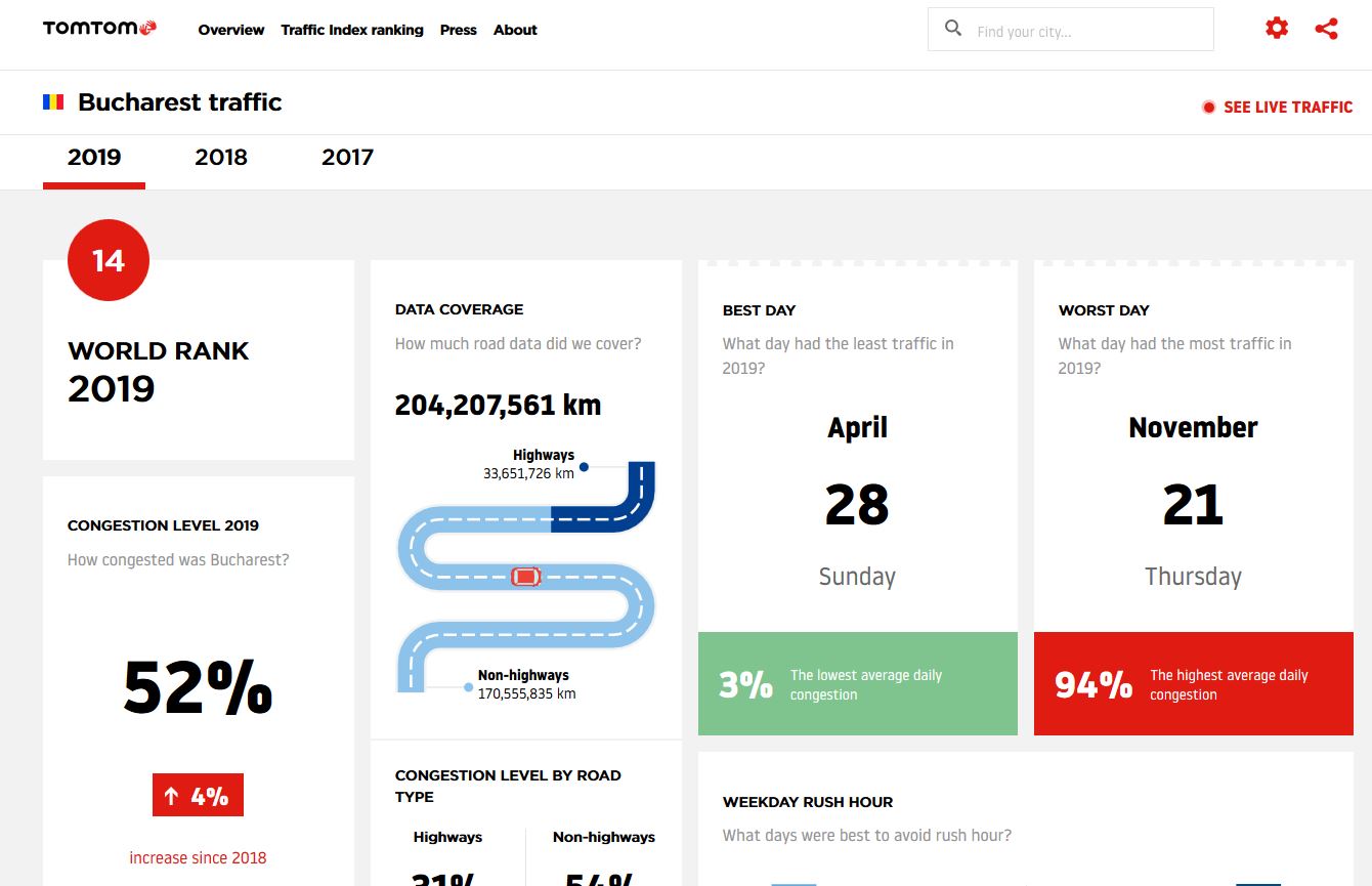 Conform datelor oferite de operator, București a avut o rată a congestiei în trafic de 52% în 2019, fiind surclasat în Europa doar de Moscova (59%), Istanbul (55%) și Kiev (53%). Într-un clasament global, București este pe locul 14, primele locuri fiind ”rezvate” de Bengaluru, India (71%), Manila, Filipine (71%) și Bogota, Columbia (68%).
