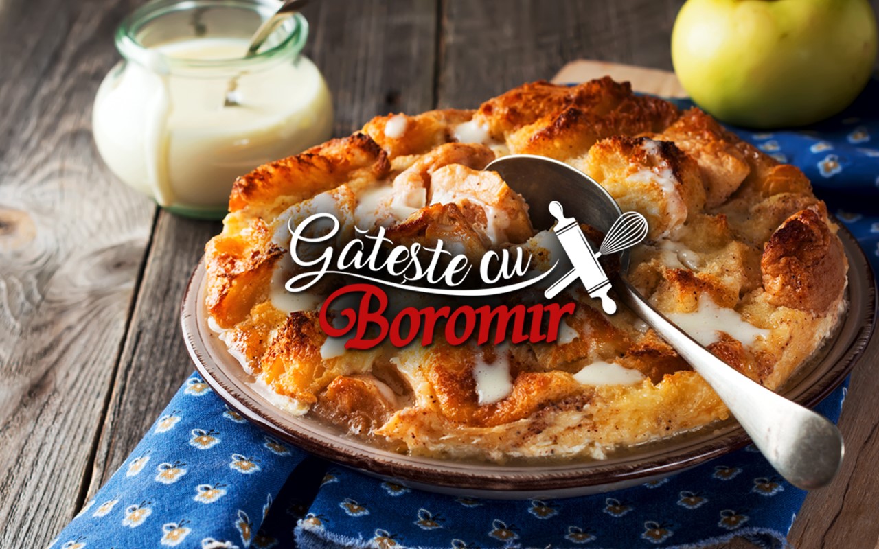 Cozonacul Casa Boromir cu cremă de nuci și cireșe conferă un gust unic budincii, completând perfect aroma sa fină de vanilie și textura cremoasă. Iar savoarea cremei de nuci crocante și cireșe ce îmbogățește miezul pufos, se armonizează foarte bine cu merele călite și cu scorțișoara.