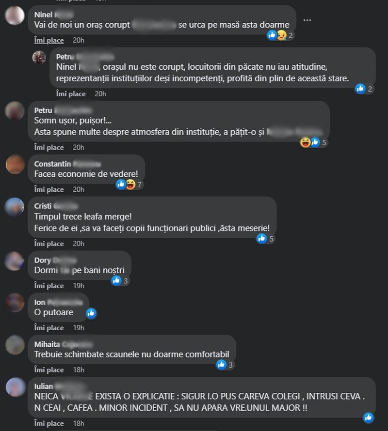 În imagini se vede cum șefa de instituție, aflată în timpul programului de muncă, doarme adânc. Gorjenii sunt revoltați din cauza gestului femeii, iar, potrivit unor surse, în afara salariului aferent, femeia primește și spor de condiții periculoase.