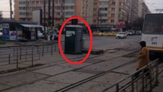 Pe linia tramvaiului 32 a aparut o toaleta ecologica amplasata chiar in mijlocul intersectiei!