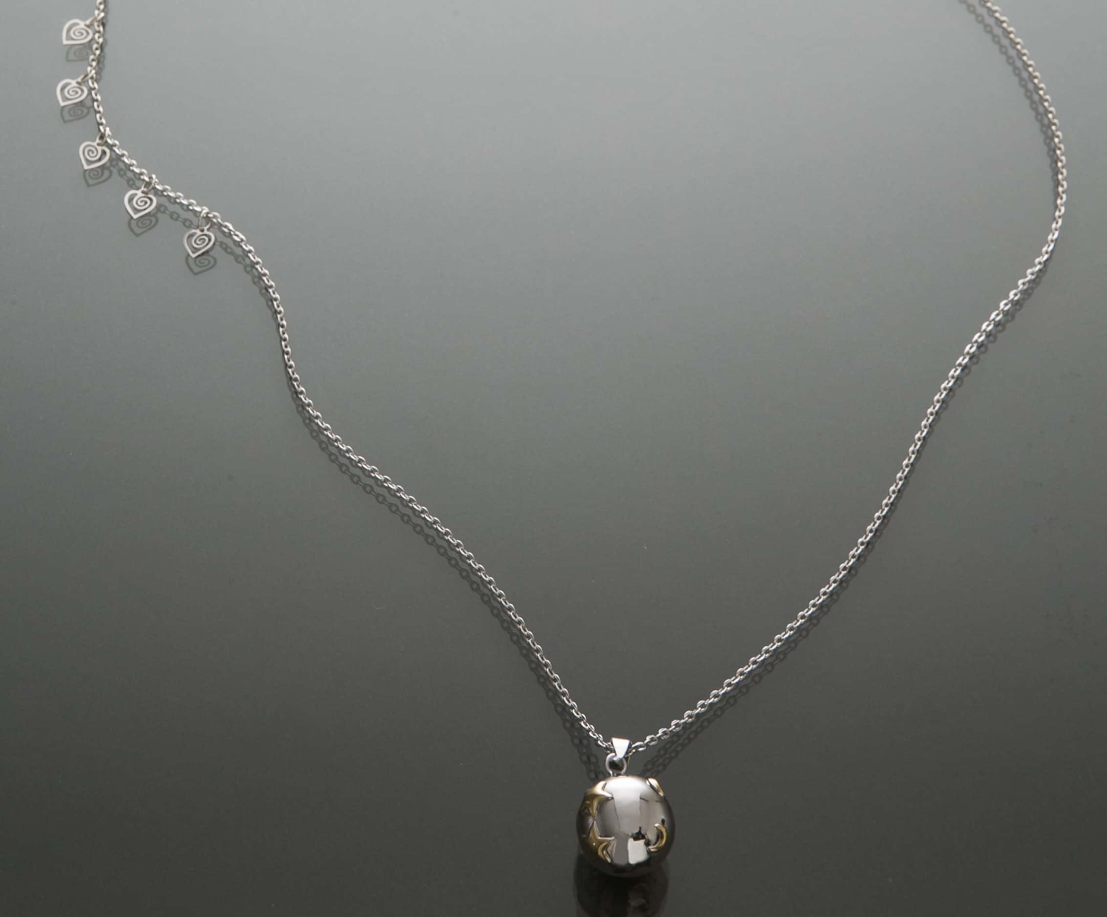 Inspirat de un pandantiv ancestral purtat de mamele mayașe, bola emite un sunet asemănător unui mic clopoțel care leagăn și liniștește copilul. Atât discret cat si elegant, acest colier lung se poarta pe burta ca o adevărată bijuterie.