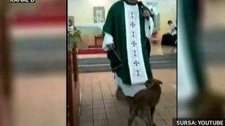 Ne mai avand incotro, preotul se vede nevoit sa-ri ridice vesmantul si sa-si continue slujba.Insa catelul isi continua joaca sub privirile amuzate ale credinciosilor din biserica
