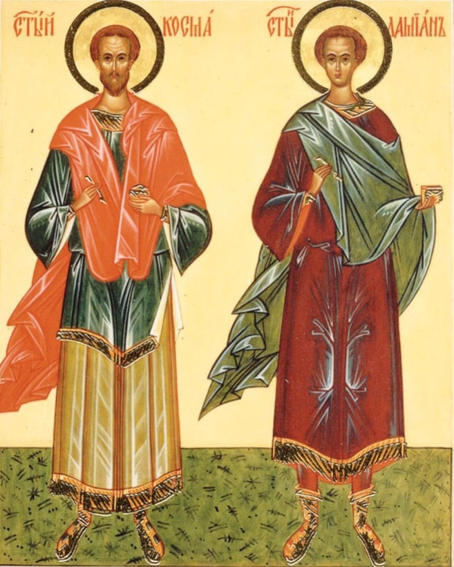 Sfintii Cosma si Damian au trait in secolul al IV lea. Aceștia s-au nascut dintr-un tata pagan si o mama crestina, in Asia Mica. Iar datorita vindecarilor oamenilor, ei sunt cunoscuti si sub numele de doctori fara arginti. Cei doi au primit acest nume pentru ca vindecarea era data nu de medicamente, ci de Hristos. Pentru acest motiv ei nu primeau niciun fel de plata de la pacientii lor. Astfel, singura lor plata era ca cel tamaduit sa creada in Hristos. Pentru ca Damian a acceptat trei oua de la Palladia, o femeie care a fost vindecata de o boala, acesta a cerut sa nu fie ingropat alaturi de fratele sau.