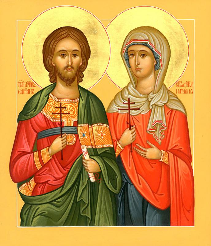 Sfinții Adrian și Natalia, soț și soție, au trăit în Nicomidia, în vremea împăratului Maximian. Spre deosebire de soția lui, Natalia, care era creștină, Adrian era păgân și pretor al Nicomidiei. Adrian a ales să devină creștin la vârsta de 28 de ani, după ce a aăzut bcurajul a 23 de creștin din timpul unei persecuții.
