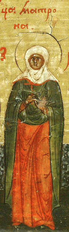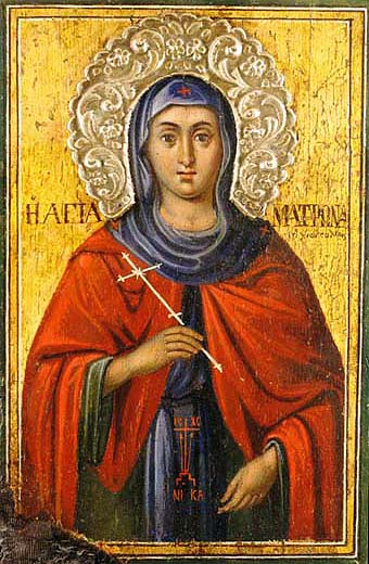 Sfânta Matroana a fost slujnică la o evreică, anume Pavtila, femeia voievodului Tesalonicului. Din tinerețe, fiind învățată în credința creștinească, stăpâna ei o silea la reaua credință iudaică. Și, fiindcă ea nu se supunea, o chinuia foarte rău, bătând-o adeseori. Însă Matroana pe toate le răbda cu osârdie pentru Hristos și la biserică se ducea într-ascuns. Într-una din zile, înștiințându-se Pavtila că Matroana a fost la biserica creștinească, i-a zis: „Pentru ce n-ai mers la sinagoga noastră, ci te-ai dus la biserica creștinească?”. Răspuns-a fericita Matroana cu îndrăzneală: „De vreme ce Dumnezeu este în biserica creștinească, iar de la sinagogă iudaică s-a depărtat, nu mă duc la sinagogă, ci la biserică”.