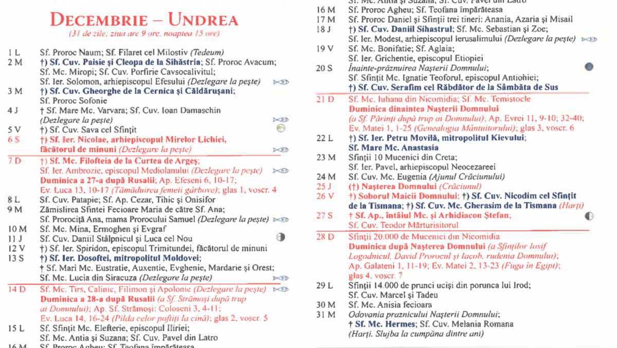 Ultima lună din an este una dintre cele mai bogate în sărbători din calendarul ortodox, cu o combinație între praznice mari și pomenirea sfinților mucenici și proroci. În această perioadă, credincioșii sunt invitați să se roage, să participe la slujbe și să reflecteze asupra semnificației spirituale a fiecărei zile.