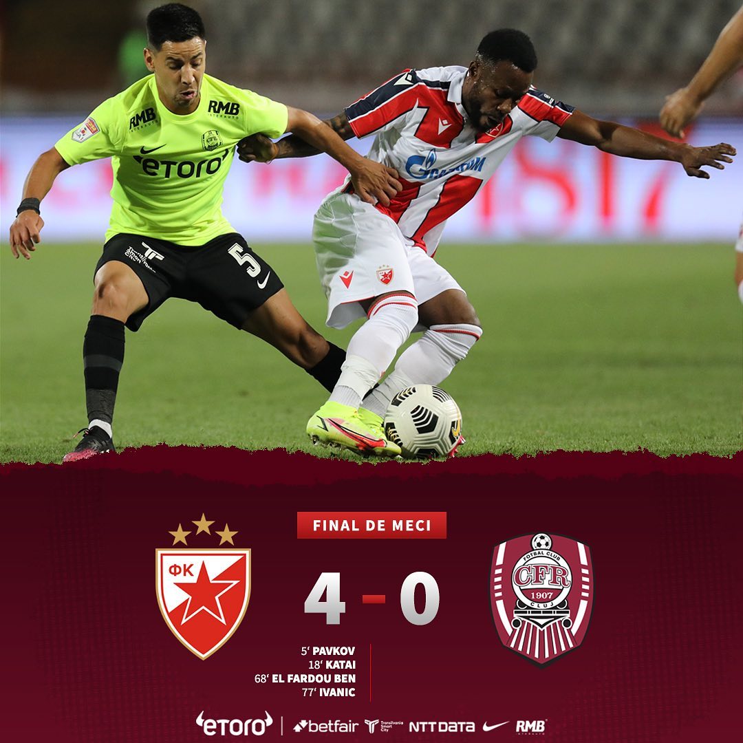 CFR Cluj a fost umilită de Steaua Roșie Belgrad în prima manșă a play-off-ului Ligii Europa. Sârbii s-au impus cu 4-0, aceasta fiind una dintre cele mai severe înfrângeri suferite de ardeleni în cupele europene de-a lungul timpului.