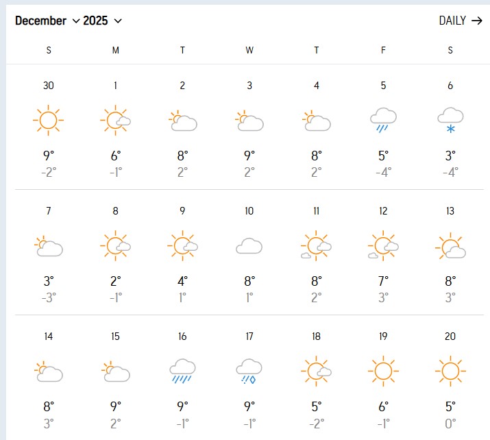Conform datelor publicate de AccuWeather, în jurul datei de 6 decembrie, temperaturile în Capitală vor scădea simțitor, urmând să atingă valori apropiate de zero grade pe timpul zilei și chiar negative în timpul nopții. În aceste condiții, precipitațiile sub formă de ninsoare sunt foarte probabile, marcând debutul oficial al iernii meteorologice în București.