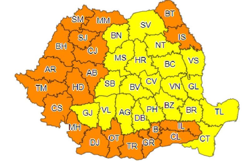 Ziua de duminică vine cu un cod portocaliu de caniculă în județele Satu Mare, Maramureş, Sălaj, Cluj, Alba, Hunedoara, Bihor, Arad, Timiş, Caraş-Severin, Mehedinţi, Dolj, Olt, Teleorman, Giurgiu, Călăraşi, Ialomiţa, Botoşani şi Iaşi, precum şi în municipiul Bucureşti.