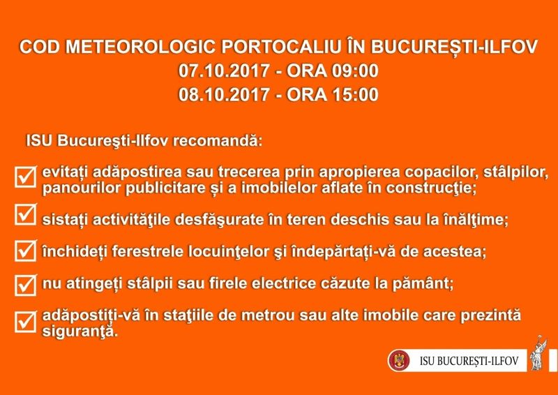 ISU Bucuresti Ilfov a transmis si ce masuri s-au luat in conditiile emiterii codului portocaliu de ploi insemnate cantitativ si vant intens: