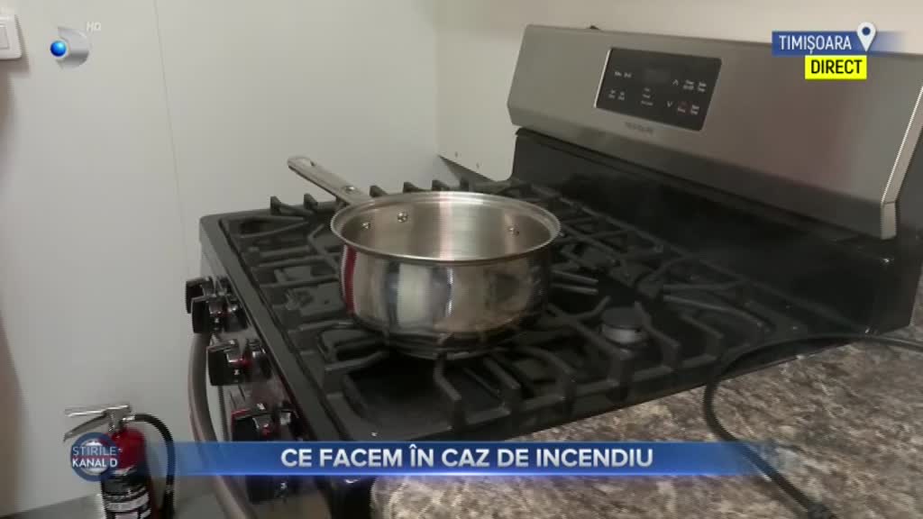Dragoș Văslan, sublocotenent ISU Timiș: „În această situație nu intervenim niciodată cu apă. Singura variantă pe care o avem la dispoziție este să acoperim cu un capac sau cu un tocător, fie să folosim un prosop care l-am umezit. Astfel, stopăm alimentarea cu oxigen iar flacăra nu va mai putea arde.”