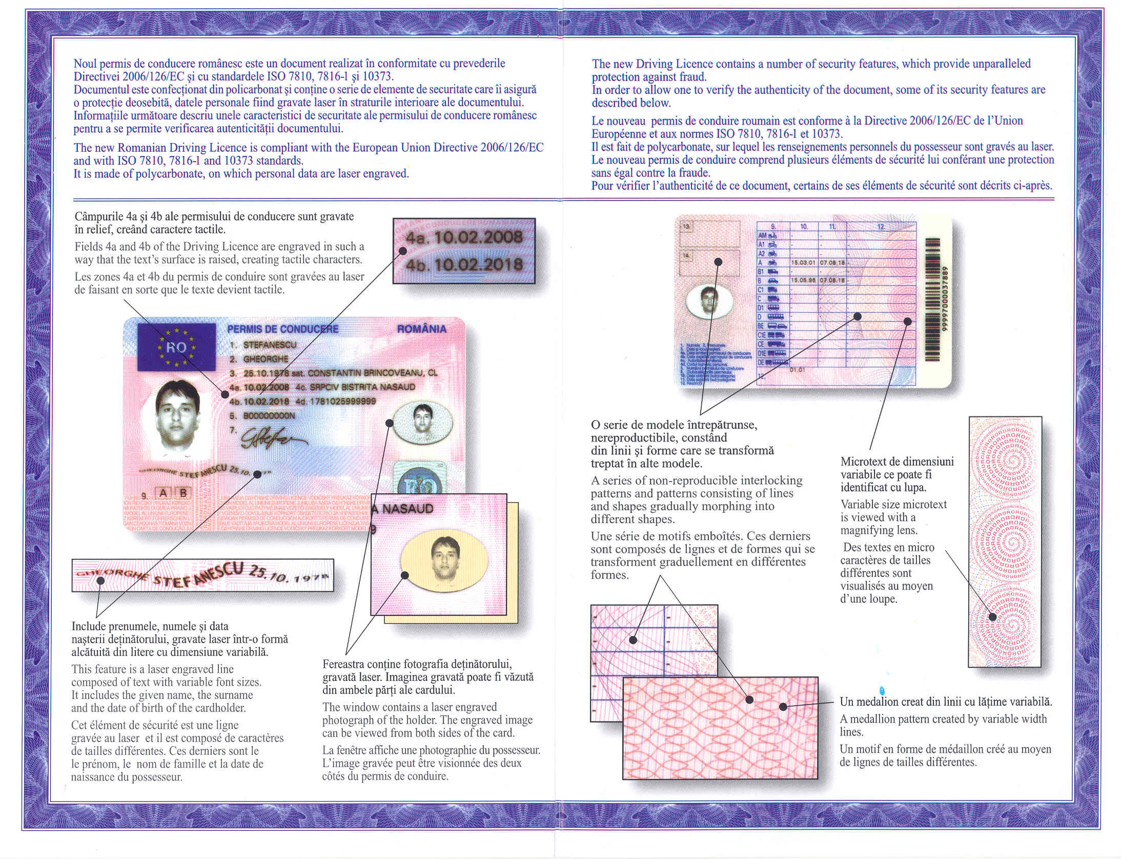 - Fereastra care conține fotografia șoferului este este realizată cu laserul. De asemenea, imaginea gravată poate fi vizibilă de pe ambele părți ale permisului.