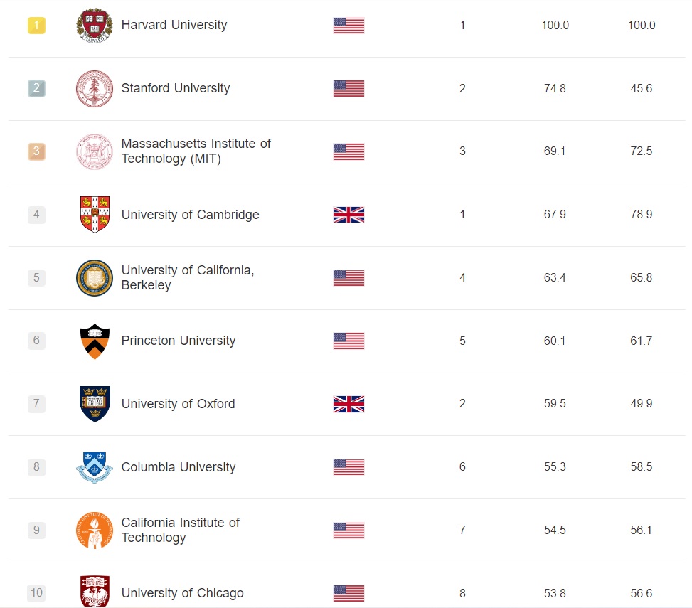 Potrivit ediției din 2023 a Academic Ranking of World Universities (ARWU), publicată de Universitatea Shanghai Jiao Tong, primele trei cele mai bune universități din lume sunt Harvard, Stanford și Massachusetts Institute of Technology (MIT).