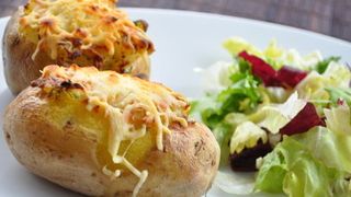 Când sunt gata cartofii, trebuie tăiați pe mijloc până la jumătate.