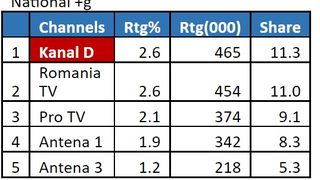 Ieri, în intervalul orar 16:00 – 18:00, Kanal D a înregistrat 2.6 puncte de rating și 11,3% cota de piață, pe targetul Național, și 1.9 puncte de rating și 10,5% cota de piață, pe targetul Comercial (21-54 Național ABCD).