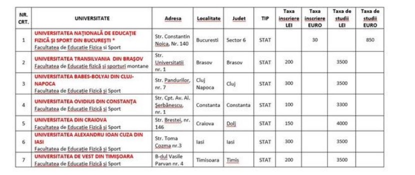 - 850 EURO* reprezintă cea mai mare taxă de studii în cadrul Universității Națională de Educație Fizică și Sport din București