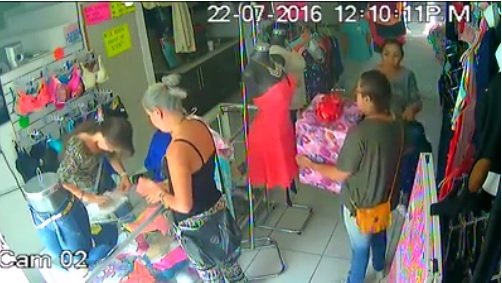 In timp ce cealalta femeia se preface ca se uita la haine, iar in momentele de neatentie ale vanzatoarei, le impacheteaza si i le da prietenei sale pentru a le baga in cutie.