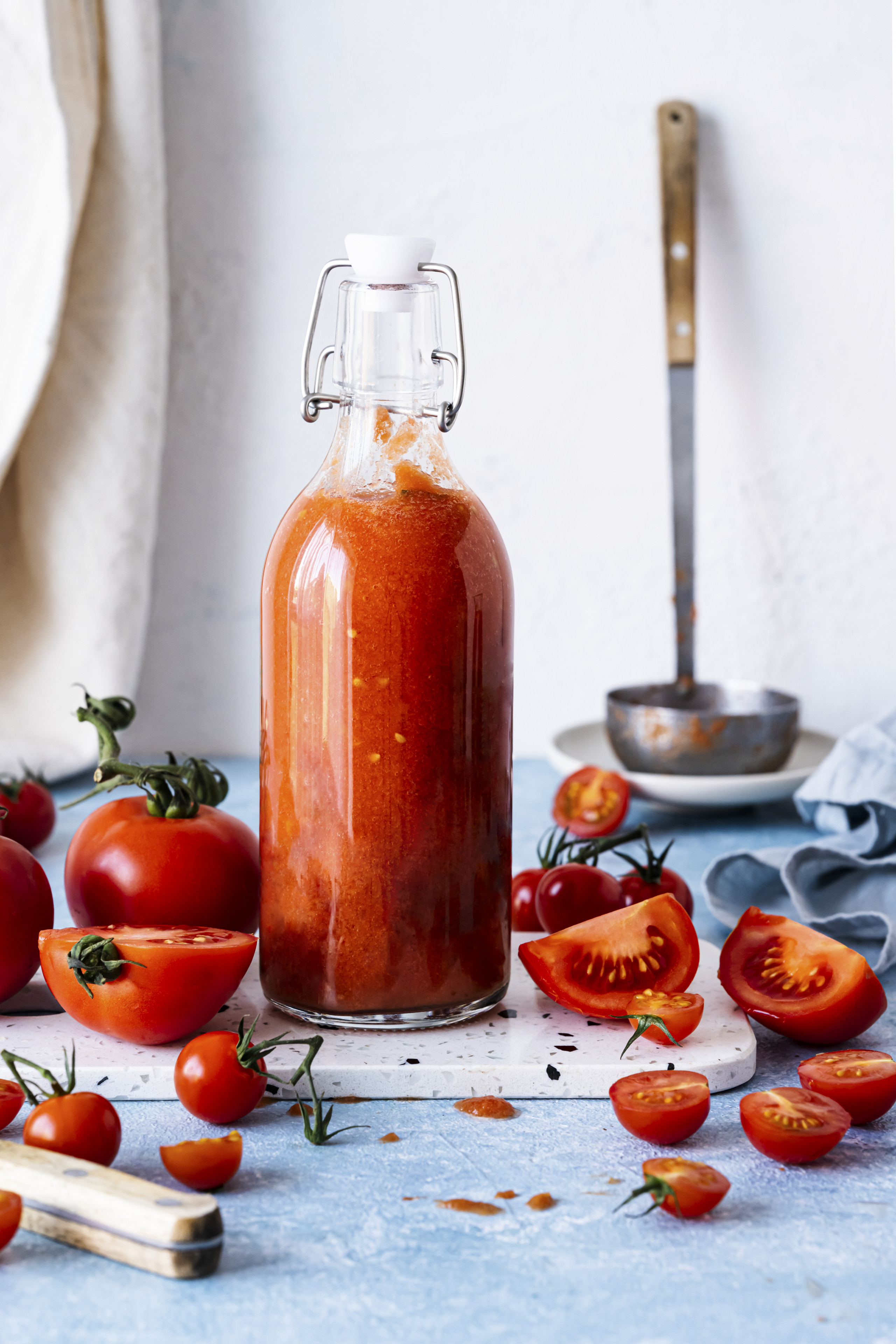 Fierbe roșiile la foc mic, amestecând din când în când, până când se înmoaie și își lasă sucul.După ce roșiile au fiert și s-au înmuiat, pasează-le folosind o sită sau un blender. Sucul rezultat trebuie să fie cât mai omogen și fără semințe sau coji.
