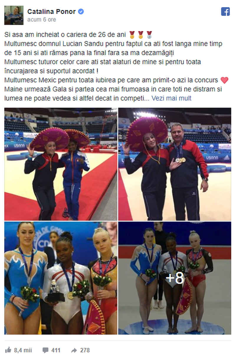 Gimnasta si-a anuntat retragerea inca din luna octombrie, in timpul Campionatului Mondial de la Montreal. Isi incheie cariera cu un palmares de 23 de medalii. Sambata a participat la ultimul concurs din cariera sa, in Mexic, la ”Abierto Mexicano de Gimnasia”.