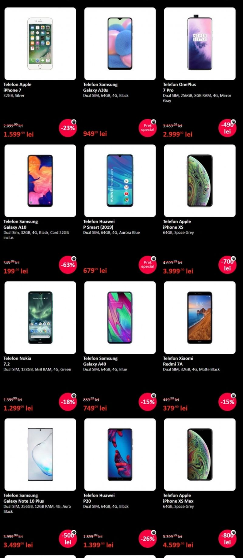 Huawei P30 Lite costă doar 799 lei mai nou (999 lei în general), iar iPhone XS coboară la 3.999 lei (de obicei e 4200 lei peste tot). Mare atenţie şi la Samsung Galaxy Note 10 Plus la 3.499 lei, după ce a tot fost 3999 lei o bună perioadă de timp. E versiunea cu 12 GB RAM, 256 GB stocare şi Aura Black.
