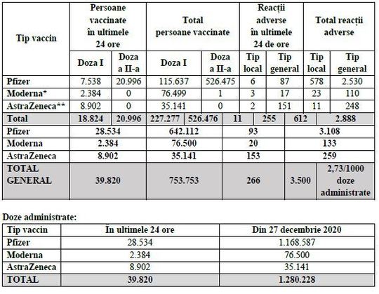 Numărul total al persoanelor vaccinate a ajuns astfel la 753.753, din care 642.112 cu Pfizer, 76.500 cu Moderna şi 35.141 cu AstraZeneca.