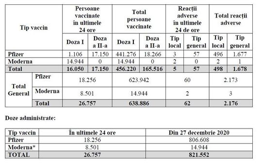 Comitetul Naţional de Coordonare a Activităţilor privind Vaccinarea anti-COVID-19 (CNCAV) a transmis, vineri, că în ultimele 24 de ore au fost vaccinate peste 26.000 de persoane şi au fost înregistrate 62 de reacţii adverse.
