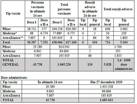Numărul total al persoanelor vaccinate a ajuns astfel la 1.065.226, din care 814.943 au primit serul Pfizer, 84.664