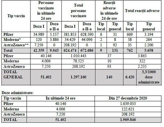 Comitetul Naţional de Coordonare a Activităţilor privind Vaccinarea împotriva COVID-19 (CNCAV) a anunţat, miercuri, că în ultimele 24 de ore au fost vaccinate peste 51.000 de persoane şi au fost înregistrate 140 de reacţii adverse.