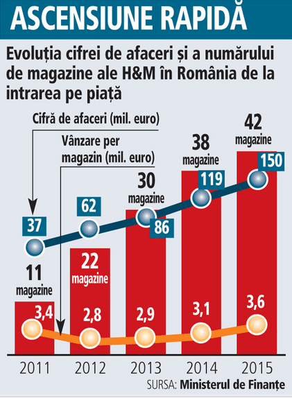 Daca in 2011, cand deschidea primele magazine in Romania, cifra de afaceri a retailerului de moda era de 37 de milioane de euro, anul trecut gigantul suedez a inregistrat o cifra de afaceri de 150 milioane de euro, in crestere cu 25% fata de anul anterior si cu 74% mai mare decat in 2013.