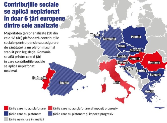 În același timp, majoritatea țărilor analizate care au impozit progresiv sau cote diferențiate de impozit, au contribuțiile sociale plafonate maximal, pentru a echilibra povara fiscală totală asupra muncii.