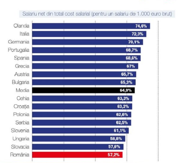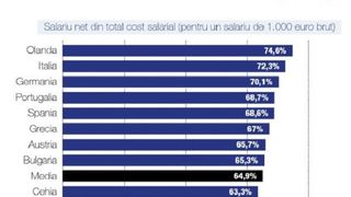 La un calcul simplu rezultă că pentru un salariu brut lunar de 1.000 euro (5.000 lei), românii au cel mai mic salariu net.
