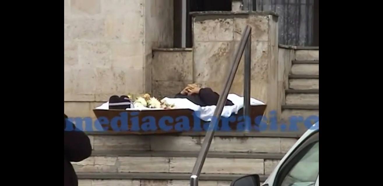 3 din 3 | Caz halucinant la Calarasi! Pentru ca nu a putut sa scoata banii de pe un cont al unui decedat desi era imputernicit, un barbat a adus cosciugul cu trupul neinsufletit in fata bancii!