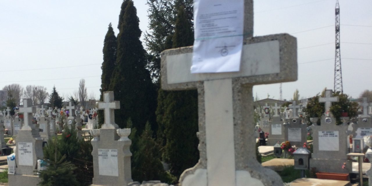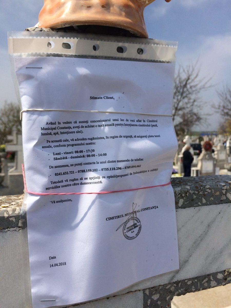 Din pacate nu este o gluma! Pe crucile unui cimitir din Constanta au aparut hartii prin care concesionarii locurilor de veci sunt somati sa-si achite taxele!