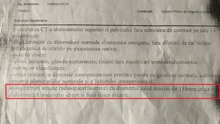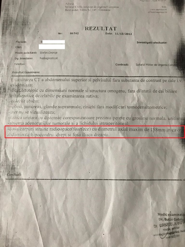 Potrivit concluziilor examenului CT, publicate de ziarul „Libertatea”, în corpul pacientei au fost descoperite „două corpuri străine radioopace (foarfece) cu diametrul axial de 158 mm în cavitatea abdominală: hipocondru drept şi fosa iliacă dreaptă”.