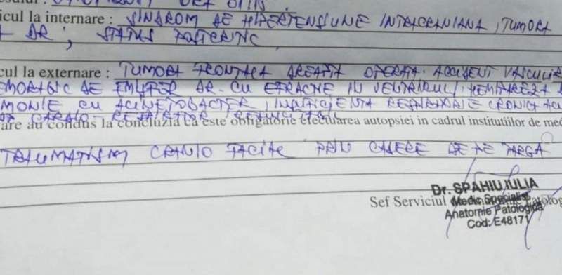 ”Bunicul meu a fost internat la spitalul județean din Ploiești. A avut o tumoră la cap, a stat aproape două luni în spital, l-au operat și totul decurgea normal.. Începuse să vorbească, să deschidă ochii, cu alte cuvinte își revenea.. Dar vineri (n.r. 4 ianuarie) ne-au sunat de la spital să ne spună că a murit..
