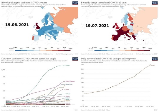Cazurile s-au dublat în Cipru, în UK și Olanda. În Europa a crescut incidenţa cazurilor de aprox. 3,4 ori în 19.07.2021, comparativ cu o lună în urmă.
