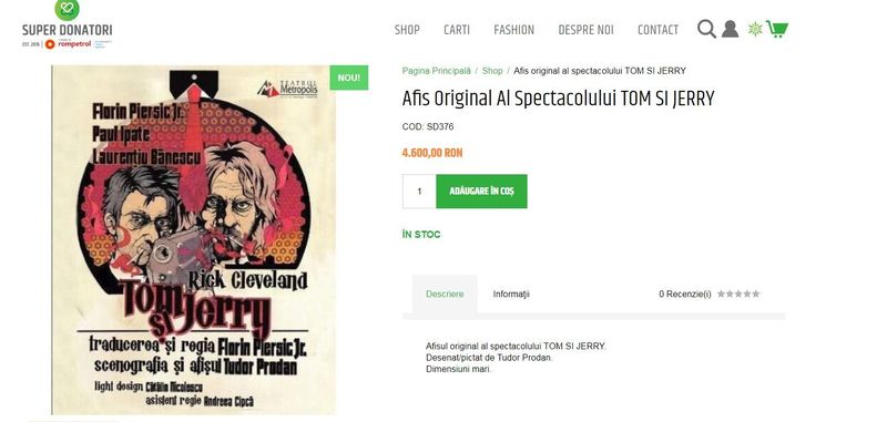 Florin Piersic Jr a donat organizatiei un afis original, realizat pentru unul din specatolele sale. “Afisul original al spectacolul Tom si Jerry. Pretul de vanzare este de 4.600 de lei”, se arata pe portalul superdonatori.ro.