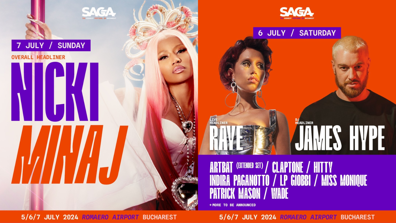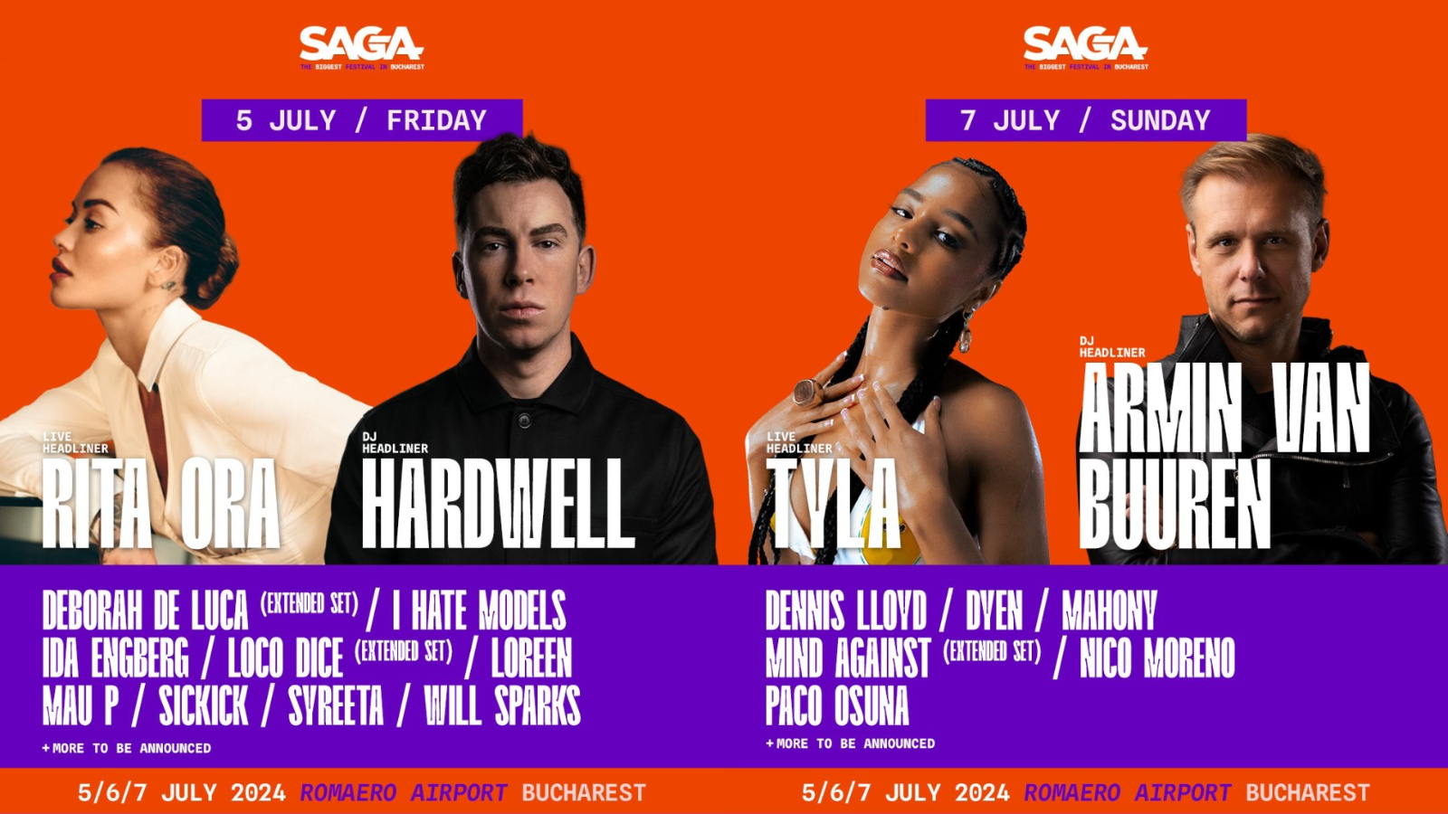 Pe parcursul celor trei zile de festival zeci de artiști vor urca pe scenă. Printre numele mari de la Saga Festival se numără Rita Ora si Hardwell, care vor urca pe scenă vineri, pe 5 iulie, RAYE și James Hype, pe 6 iulie, sâmbătă. Ultima zi de festival se anunță a fi una incendiară. În fața publicului vor apărea Tyla, Dennis Lloyd și celebrul DJ de origine olandeză Armin van Buuren.
