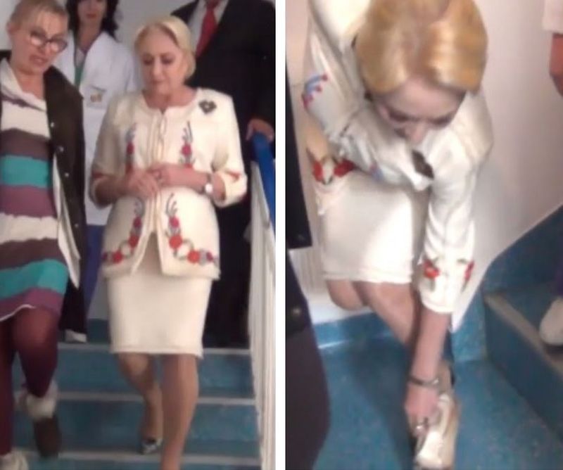 Dăncilă s-a împiedicat în timp ce cobora scările, alături de mai mulți oameni prezenți la vizita maternității. Premierul s-a sprijinit de o jurnalistă, iar pantoful ei s-a agățat într-o stinghie din aluminiu. Pentru câteva secunde, Viorica Dăncilă a stat fără pantof, moment surprins de camerele video.