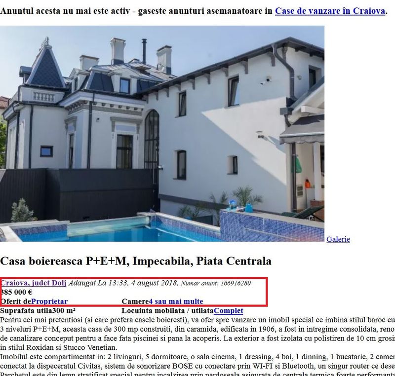 Vila din centrul Craiovei achiziționată de Claudiu Manda pentru viitoarea lui soție, Lia Olguța Vasilescu, a fost scoasă la vânzare în luna august pe un site de intermedieri pentru suma de 385.000 euro. Anunțul care între timp a devenit inactiv, a fost postat de un anume Florin, care mai are la vânzare o casă ”de lux”, două apartamente, un laptop și o tabletă, toate de pe același cont.