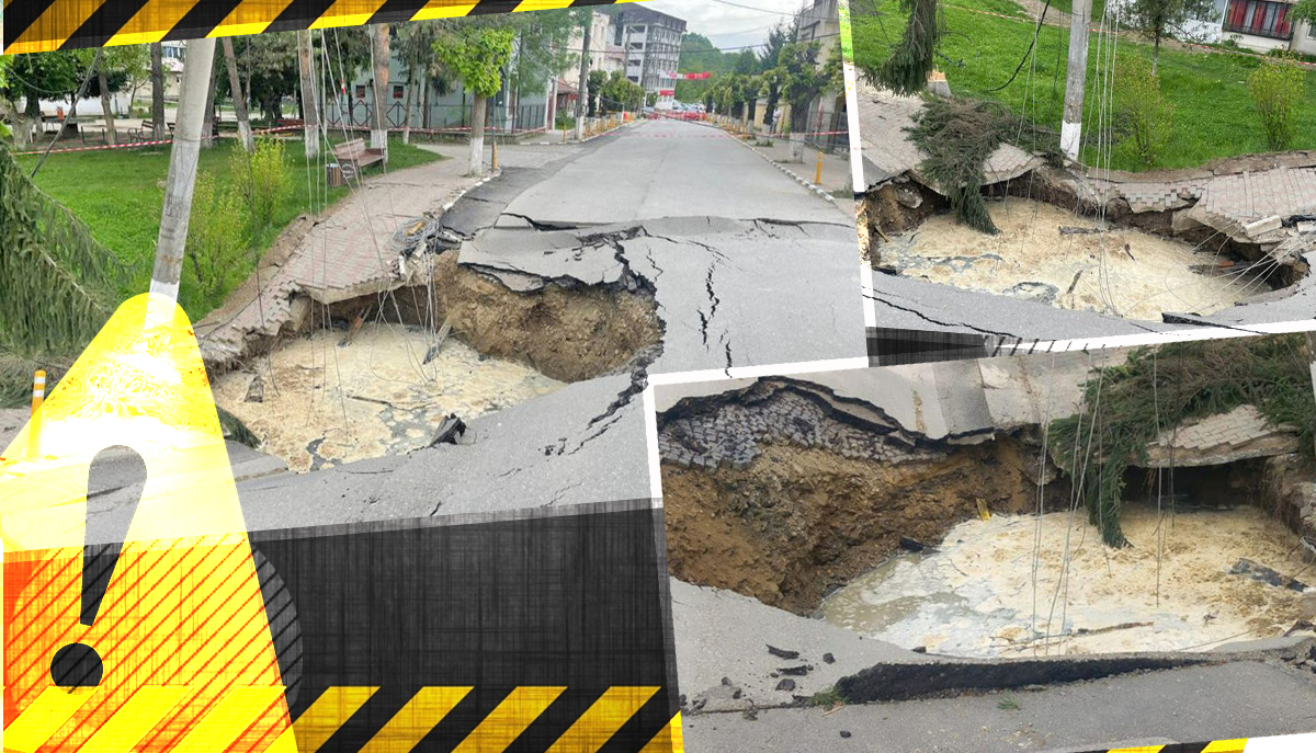 1 din 4 | Alertă în Slănic Prahova, după ce craterul din asfalt a ajuns să aibă 18 metri adâncime. Ce spun experții: ”Indicile duc către...”