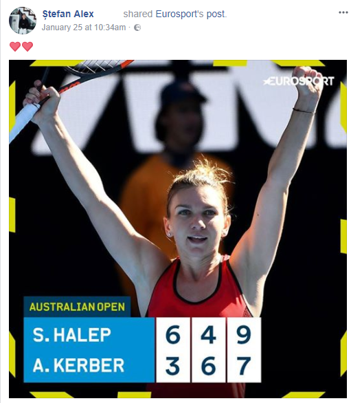 Alex era un impatimit al sportului si nu rata niciodata ocazia de a urmari competitiile mari. Ultima lui postare pe contul personal de Facebook are legatura cu Simona Halep, sportiva pe care nu stim daca a mai apucat sa o vada evoluand in finala de la Australian Open.
