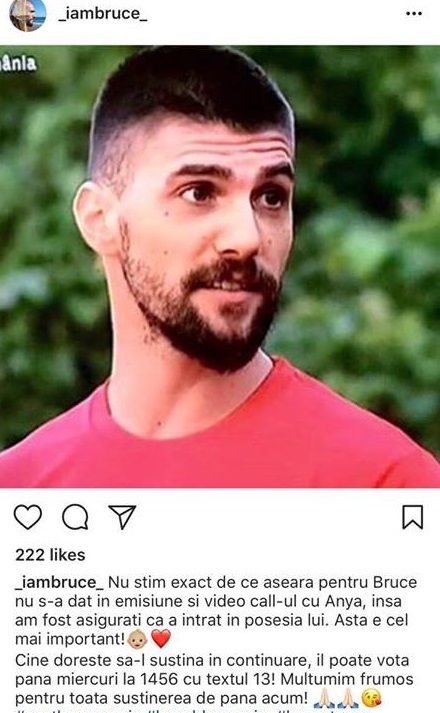 "Nu stim exact de ce aseara pentru Bruce nu s-a dat in emisiune si video call-ul cu Anya, insa am fost asigurati ca a intrat in posesia lui. Asta e cel mai important!", este mesajul postat de fanii Faimosului.