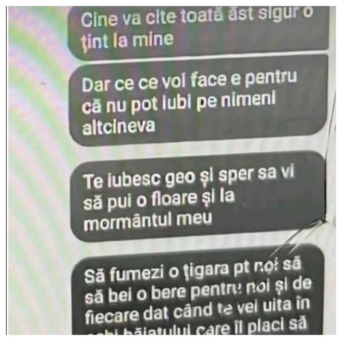 ”Ce voi face e pentru că nu pot iubi pe nimeni altcineva. Te iubesc și sper să vii să pui o floare și la mormântul meu. Să fumezi o țigară pentru noi și să bei o bere pentru noi. De fiecare dată când te vei uita în ochii băiatului pe care îl placi să îi vezi pe ai mei. Îți promit că vin la tine să te păzesc de rele. Îți doresc doar fericirea. Vreau ca la mormântul meu să puneți pozele cu mine și Geo. Le am în noptieră în dulap”, a scris Gabriel, conform Spy News.