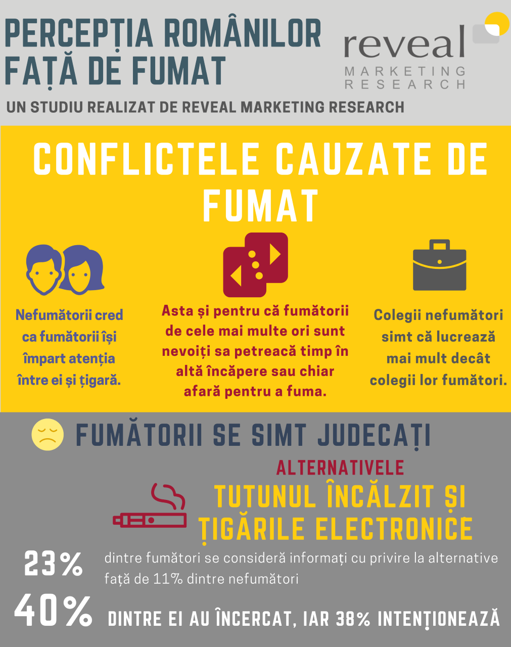 Pentru a afla răspunsurile la aceste întrebări, Reveal Marketing Research a realizat în ultimele luni un studiu reprezentativ la nivel național urban de largă audiență, pentru a descoperi percepția și atitudinea pe care românii le dezvoltă față de fumat. Au fost identificate motivele pentru care românii continuă să fumeze, modul în care fumătorii se raportează la acest viciu, dar și care sunt punctele sensibile pe care fumatul le generază în relațiile interpersonale. De asemenea, în urma studiului s-au obținut informații despre alternativele pe care fumătorii le percep ca fiind disponibile.