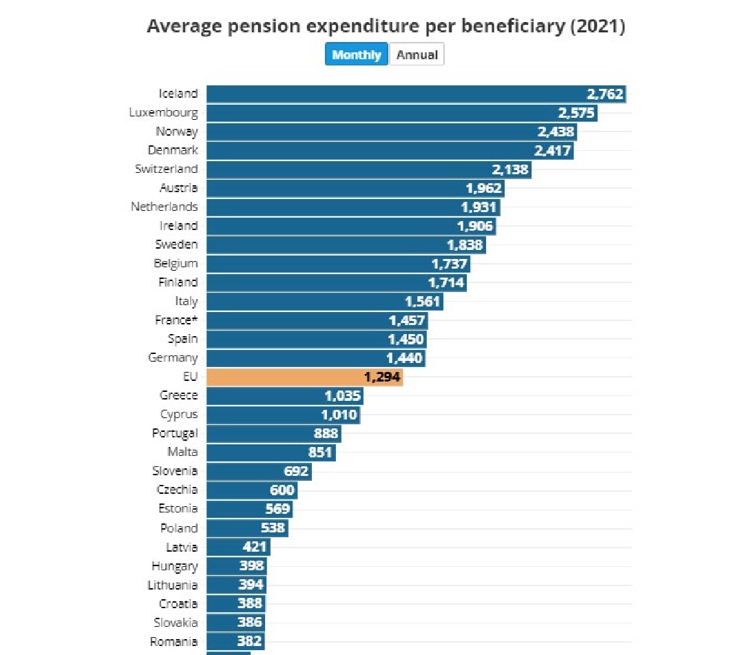 Dacă pensia medie din România era de 382 de euro, la nivelul de 2021, în Bulgaria pensia medie este de 226 euro pe lună, dar pensia medie din Uniunea Europeană este de 1.294 de euro, de patru ori mai mare!