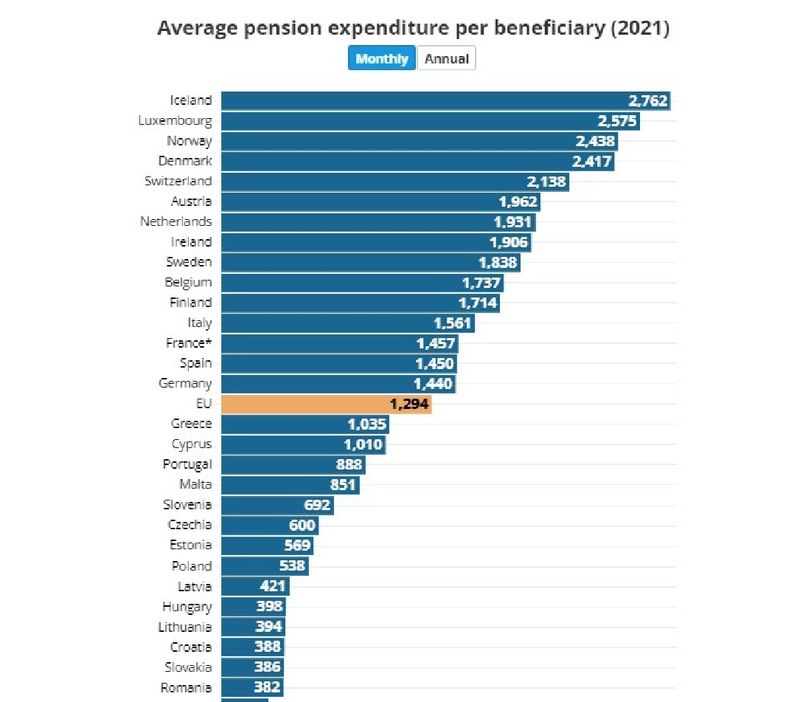 Cheltuielile medii lunare brute pentru pensia pentru limită de vârstă pe beneficiar în cadrul UE variau foarte mult în 2021, de la un nivel ridicat de 2 575 euro în Luxemburg la un nivel scăzut de 226 euro în Bulgaria.