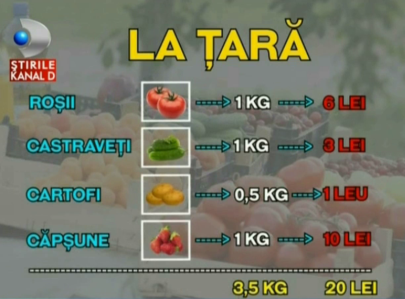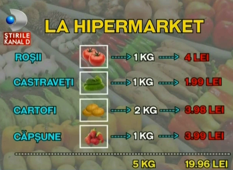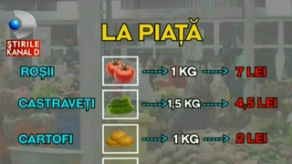 Care este cel mai ieftin, cos cu fructe si legume? Il cumparam ..direct, de la ţarani, de la piaţa sau din hiper-market? Aflam raspunsul , intr-un experiment facut pentru rubrica stirilor Kanal D "Cat te costa?"! ##VIDEO2705##