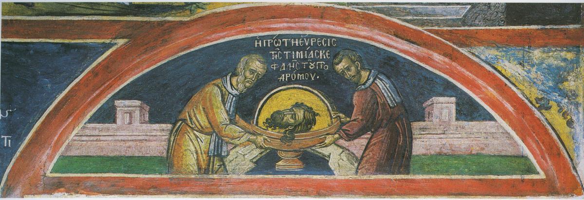 Potrivit tradiției, în timpul crizei iconoclastice, capul Sfântului Ioan a fost îngropat la Comane, fiind adus apoi la Constantinopol, de către Sfântul Ignatie (860), în vremea împăratului Mihail. Aceasta fiind cea de-a treia aflare a capului Sfântului Ioan.